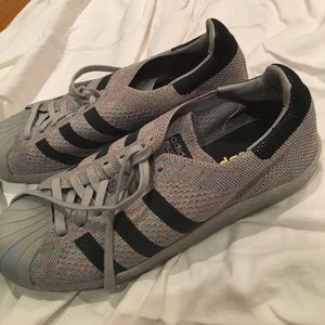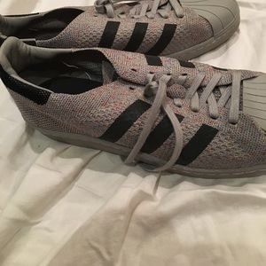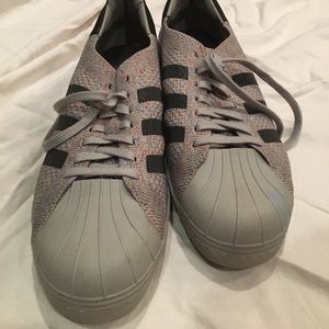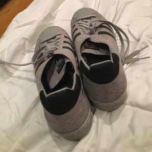 Grey adidas sneakers in perfect condition brand new out of the box has a nice grey color and black striped goes with any outfit super comfy and light weight easy to slip on and off