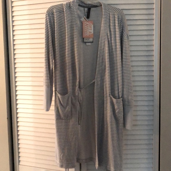 Very soft and super comfy robe that has grey and white stripes and a belt. Never worn before, tags still on.