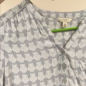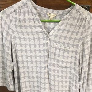 This is a button up shirt. It is patterned with grey owls. It has three quarter length sleeves. It looks good tucked into a skirt or pant and also loose. It's in good condition.