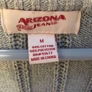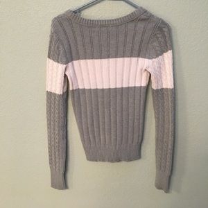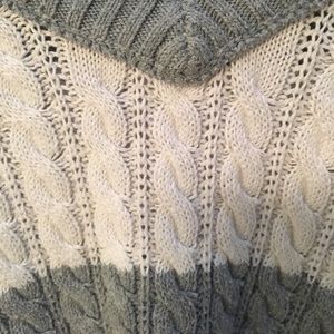 This is a nice, medium thick sweater. It's grey with a white stripe and has a thick woven pattern.