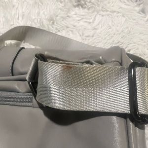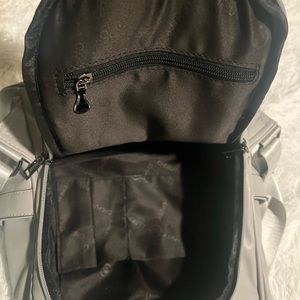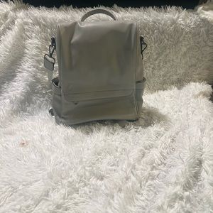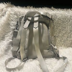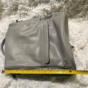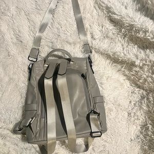 Gently used grey backpack purse with detachable shoulder strap. Two side pockets and a small front pocket. The main compartment is accessed on the back. Inside has a zippered pocket and two smaller pockets that could your phone and other small accessories. Very roomy. 1 small stain on the strap that should come out with a little scrubbing