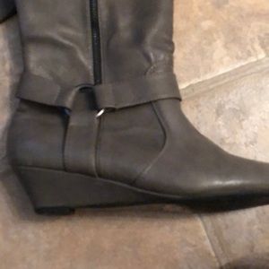 These boots are great with black leggings. Plenty of wear left. Small whole out buckle covers it up you’d never know.