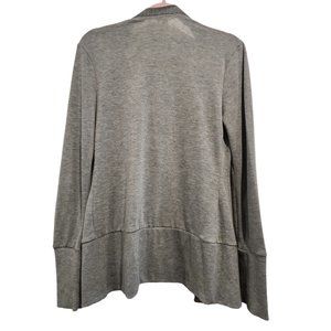 Description: Grey cardigan with a band pattern at the bottom and brass button closure