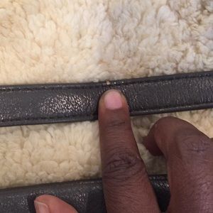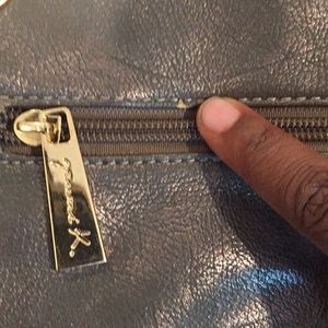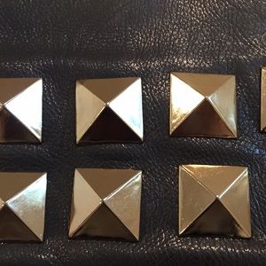 Gray handbag by yaumi K. Beautiful studded detailing on the outside. Has inner zipped pocket as well as some unzippered pockets. There is an exterior zippered pocket. There are some imperfections in the exterior which are pointed to in the pictures.