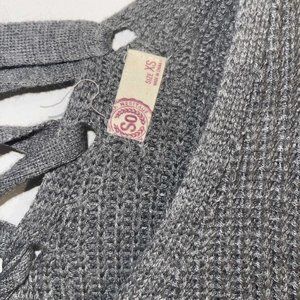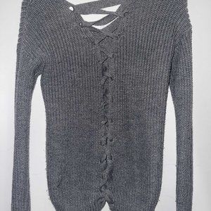 Super cute & comfortable grey sweater. The back is laced up and open.