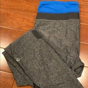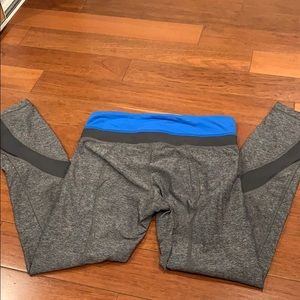 GREAT condition worn less than 5 times. Grey lululemon luxtreme tight with blue waistband. Zippers down things and mesh detail on front.