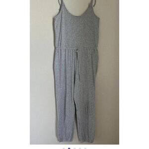 Grey Madewell jumpsuit with adjustable tie waist and drawstring and tie straps. Size small 100%cotton
