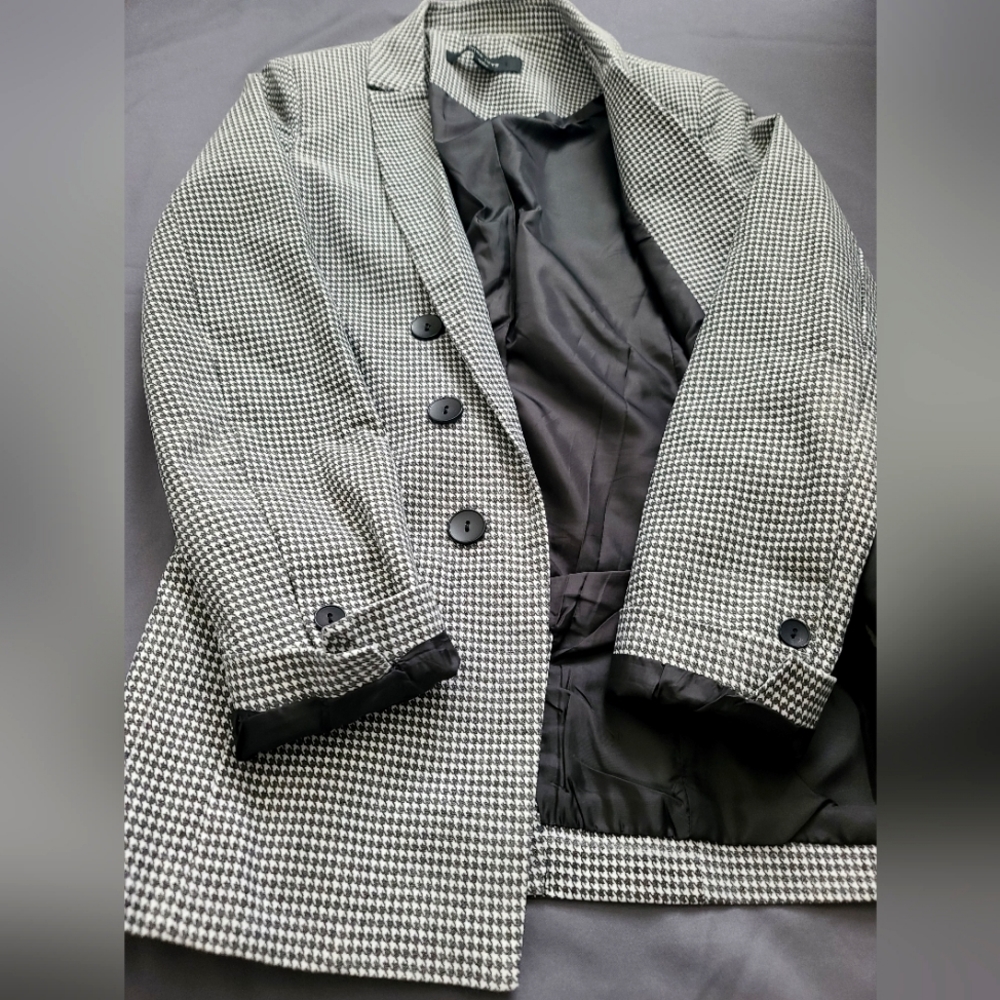 This blazer has a fun pattern to add some pizzazz to your outfit. It's a longer blazer, and the black accents make it pop. Polyester lined interior.