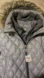 A mix of light and dark grey puffer jacket, with a fur removable hoodie