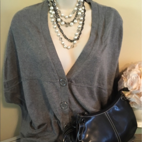 Short sleeve soft gray sweater for all seasons and most occasions.Dress up as shown here with pearl necklace and supple soft black leather Nanini bag also for sale