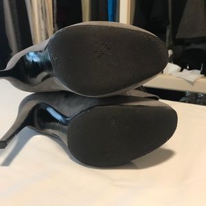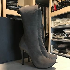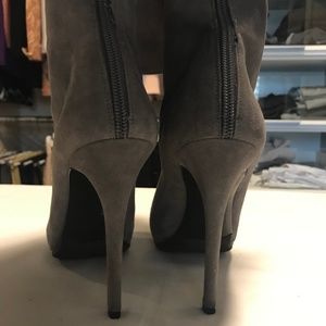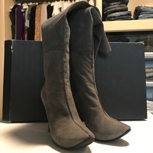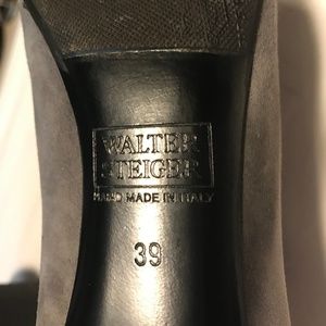 Grey suede Walter Steiger over the knee boots. Size 39. 4.5" heel; 1 3/4" platform; 16.5" shaft in back from top of heel; 12.5" circumference 10" up shaft (need small calf to wear boot). See sixth photo for loose stitches in back of boot along zipper. See last two photos for blemishes in suede. Have been resoled with rubber soles.
