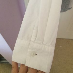 Very cute sweater! Thin material all around. High-low style. Button up shirt type material on the arms, with a single button near wrist. Not form fitting. Worn a couple of times.