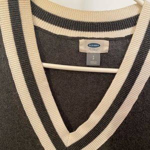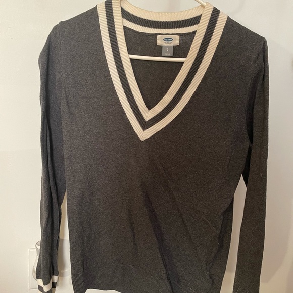 This is an old navy grey with white striped sweater , very warm, no holes or stains