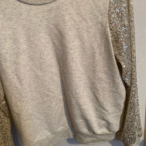 Grey sz small heart loom sweater with sparkly silver sleeves