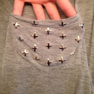Grey tank top with pocket. Pocket has little embellishments on it. Super comfy.