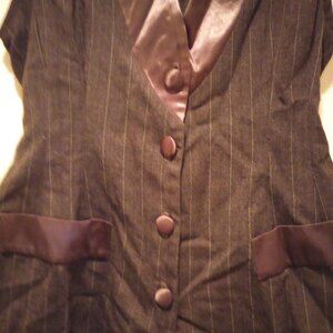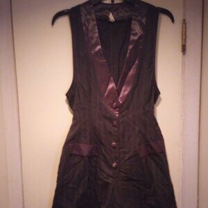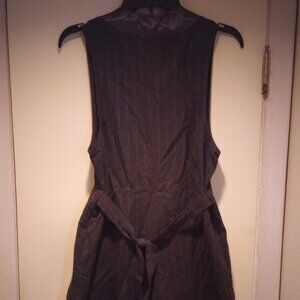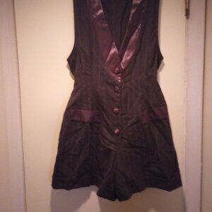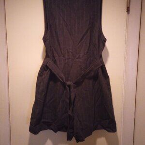 Great form fitting romper for your curves! Pin stripes, cuffed short bottom satin buttons in front and on collar, and on faux pockets, color grey! Has a tie in back. Cute with white blouse under it for work environment! Worn once then packed away!