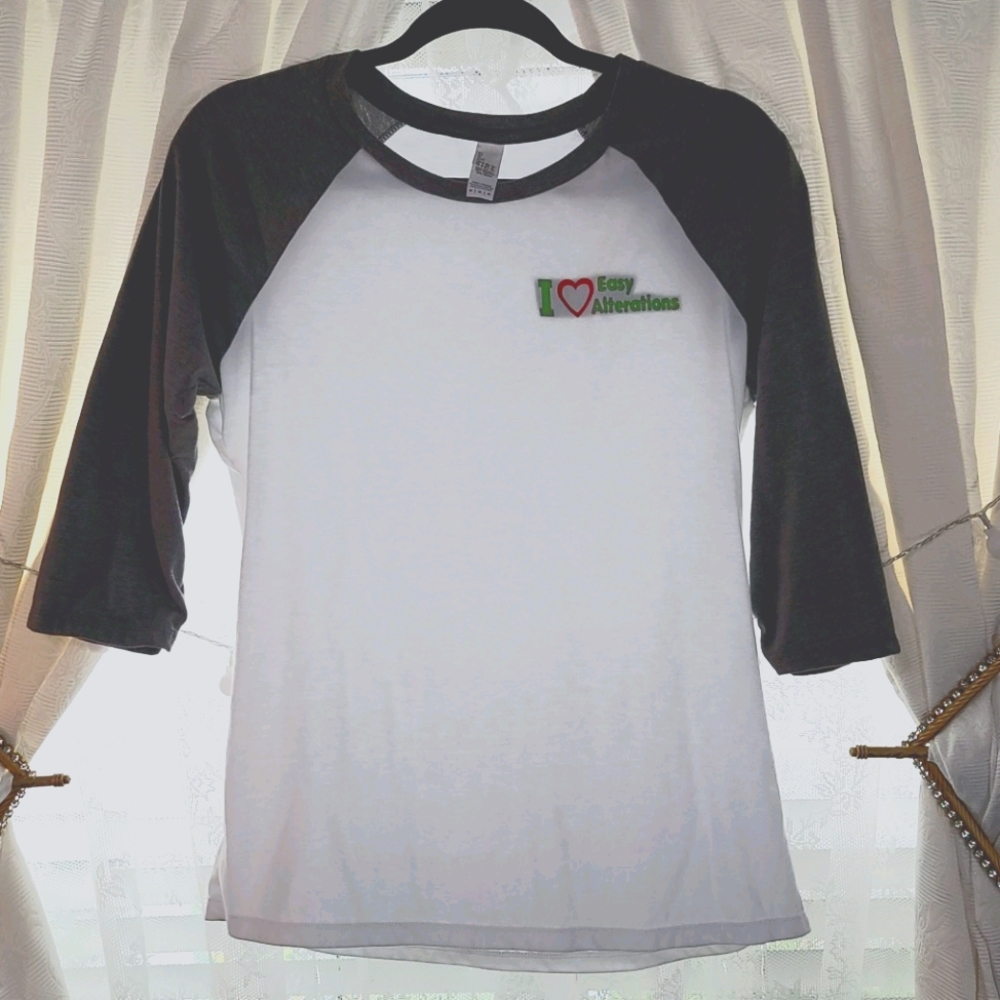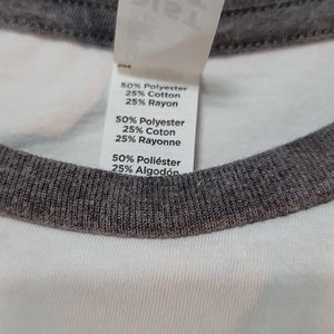 Super soft cotton & rayon blend. Bought too small, can't return. White bodice & heather grey quarter sleeves with red heart embroidery and green lettering. No piling, no rips, no tears, no stains.