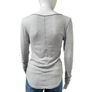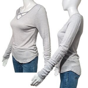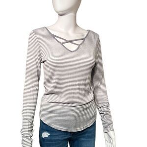 From the American Authentic Vintage perfect tee line, this long sleeve is light grey and white striped with a slimming curved hem fit & v-neckline with criss cross detail. In excellent condition without sign of wear or imperfection!