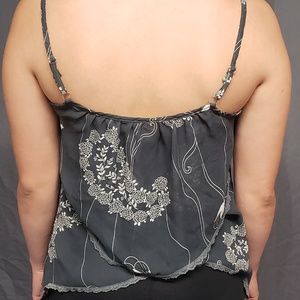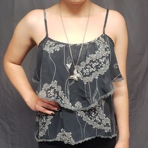 This is the cutest strappy top I've seen recently and its perfect for summertime! It is grey with white prited detail. This top has a two tier flowy type of look and feel to it and is super comfortable and super cute! Feel free to ask me anything u would like to know! Condition of top is in great just like new condition.