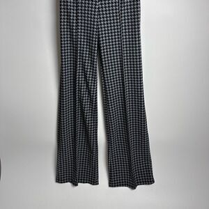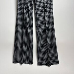 Houndstooth-patterned, high-waisted wide legged pants with an overlapping, asymmetrical waistband with front button detail and back zipper closure.