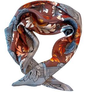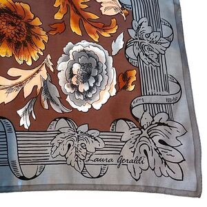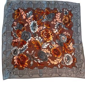 Beautiful, elegant silk scarf with fall inspired design I. Grey, browns and rust with a touch of pink. By Laura Geraldi, 29” square, excellent condition.