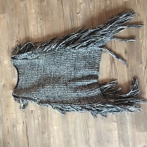 Grey-knitted, fabric-tied, sleeveless shawl.