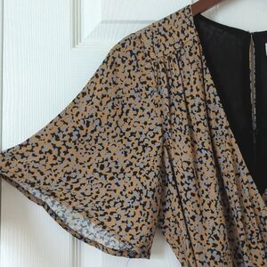 This beautiful jumpsuit features short flowy sleeves, a gathered detail at the shoulders, a surplice v-neck with a hook and eye closure, open pockets on both hips, and flowy wide legs. There is a zipper that goes up the back to two hook and eye closures. There is a matching belt at the waist to help you achieve a slimming effect! It is honey brown in color with an abstract print that's black and light blue. Pair with flats for a go to one piece outfit and layer with a chunky knit cardigan if needed! A classic, chic silhouette with a color scheme and print that's perfect for Fall!