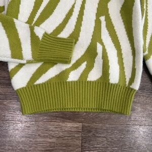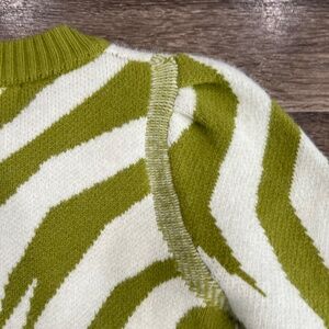 This cozy sweater knit features puff sleeves, two-toned intarsia in a fun pattern, and a crew neckline.