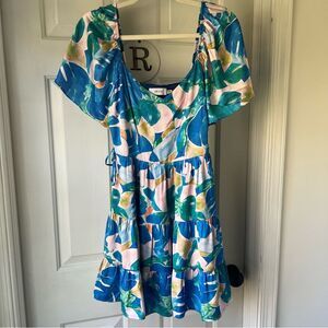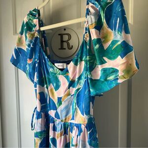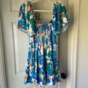 Adorned with a captivating tropical print, this dress exudes vibrancy and personality. Garment is defined by its flutter sleeves and flattering neckline. Imagined beyond sand and ocean, this dress is seen at casual occasions in the city or at outdoor activities. Design is finished off with side ties and a tiered skirt.