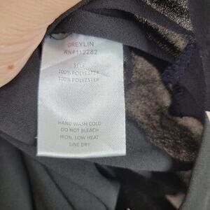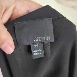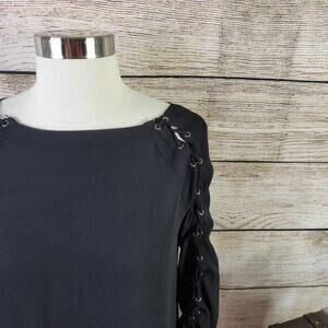Greylin Black Lace Up Sleeve Blouse. Black polyester blouse with awesome crisscross lace up sleeves and grommet details. Medium weight fabric. Long Sleeves. Semi-Sheer. Size Extra Small. Excellent Used Condition. 100% Polyester.