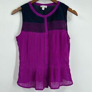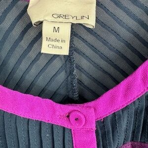 Greylin Purple Semi-Sheer Peplum Blouse in size medium. Button up design, three shades of purple polyester, pleated and peplum waistline. Gently used condition with no visible flaws.