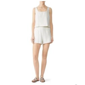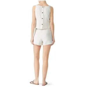 White cotton (70% Rayon, 30% Linen). Romper. Sleeveless. Square neckline. Exposed back button down closure. Hidden back zipper with hook-and-eye closure on shorts. Pockets. Partially lined. 31" from shoulder to hemline. Imported.