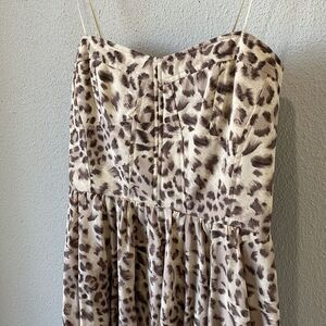 Greylin Strapless animal print dress colors are gray silver white and black for the animal print has a a fitted bust design with the flow he skirt dress is lined has a zipper and Eyehook closure, This is an excellent condition measures 26 1/2 inches in length and 15 across bust laying flat disc does have some stretch due to the elastic on the back as shown in pictures