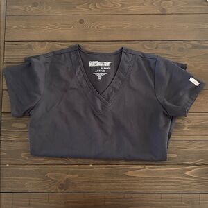Navy scrub top with V-neck. Short sleeves and front pockets.