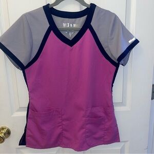 Stylish women's top by Grey's Anatomy. Features a vibrant pink front with gray sleeves. Comfortable and professional design.