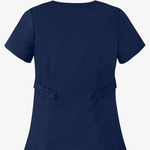 DETAILS: modern fit, v-neck, durable moisture-wicking fabric, mock wrap, 2 patch pockets, 1 hidden pen pocket, short sleeves, empire waistband, 2 back tabs with buttons