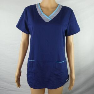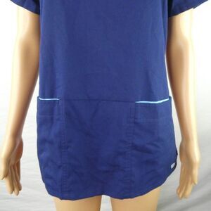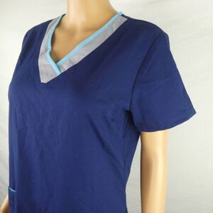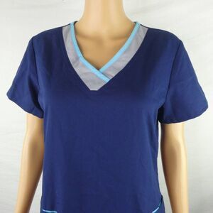 Dark blue scrub top with three pockets, light blue and grey trim. In excellent condition.