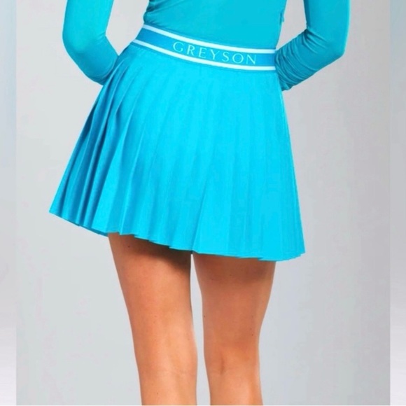Stylish blue skort by Greyson. Features a pleated design. Comfortable and chic.