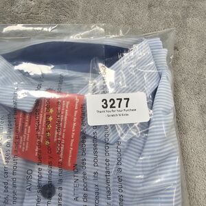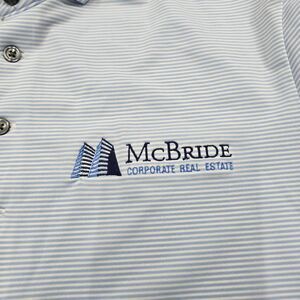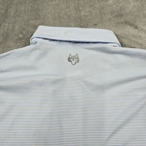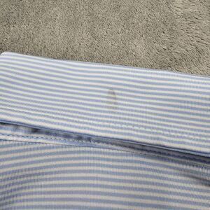 Greyson Men's Blue Striped Golf Polo Shirt Size L Has a small stain on back of neck, see pictures. Logo on front as well.