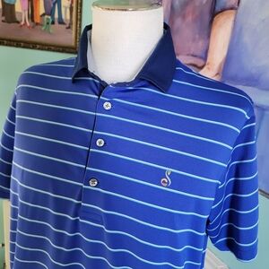 excellent condition *one minute "pick" on collar (see zoomed in photo) super hard to see royal blue with stripes navy collar embroidered logos