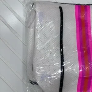 Color: White coated; pink/orange stripe; hot pink lining.