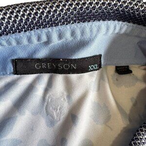 Elevate your golf style with this pre-owned Greyson XXL Men's Golf Polo. Featuring a crisp white base adorned with a stylish navy blue abstract leaf pattern, this short-sleeve polo is perfect for both the golf course and casual outings. Crafted from breathable, lightweight fabric, it ensures comfort during any activity. Key features include a buttoned placket, a striped shield logo on the left sleeve, and a contrasting blue and white collar. In excellent condition with no rips, tears, or stains. Size: XXL (34.5" length, 27" pit to pit). Machine washable and made in Peru.
