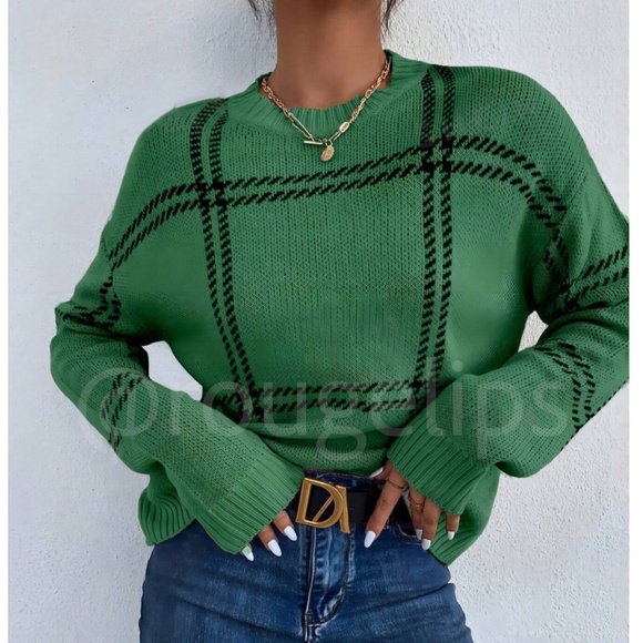 Grid Plaid Pattern Green Knit Crew Neck Pullover Sweater