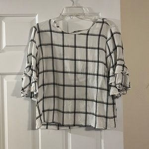 A semi-sheer woven top featuring an allover grid print, a round neckline, short sleeves with tiered ruffled cuffs, a boxy silhouette, and deep scoop back with a support strap. Forever 21 contemporary brand.