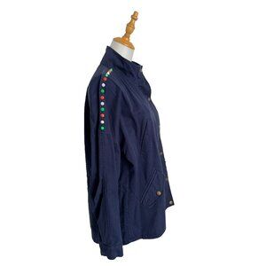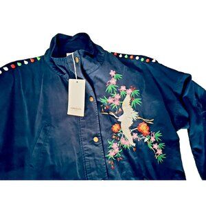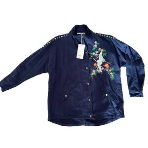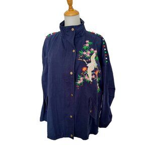 Grifflin Paris Women’s Embroidered Navy Blue Jacket Size M Floral Crane Zip Snap