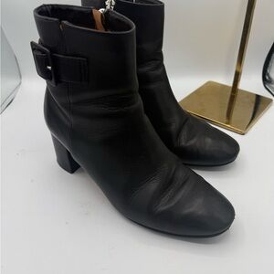 These black ankle boots feature a stylish chunky block heel and a decorative buckle detail on the outer side. Made from smooth leather, they offer a classic design that pairs well with various outfits. The slightly rounded toe shape adds to their versatile appeal. Please check photos for condition and measurements