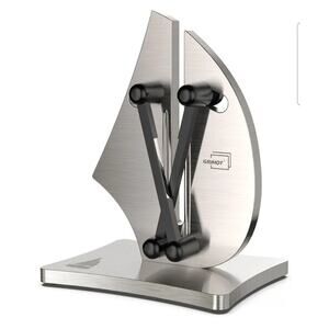 High-performance stainless steel knife sharpener with ergonomic sailboat-inspired design. Perfect for home kitchens or professional use.