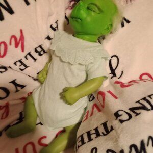 This item is about 19 inches in length,it has white hand rooted mohair and has been painted with air dry paint it has a soft cloth body that makes it easy to cuddle with she comes with her outfit pacey,and a blanket if you love the grinch you will enjoy this grinch baby