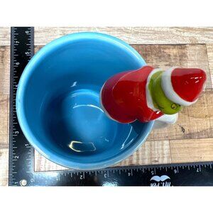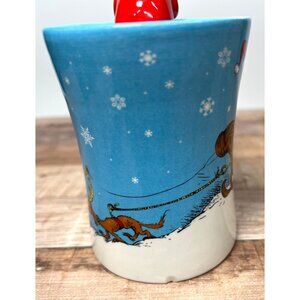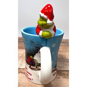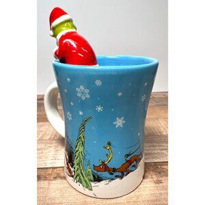 A whimsical ceramic mug featuring the iconic Grinch character from Dr. Seuss's beloved holiday tale. The mug captures the playful spirit of the story with a detailed winter scene and snowflake motif, complemented by a charming 3D Grinch figurine as a lid topper.