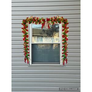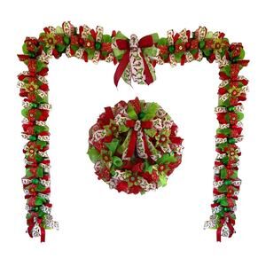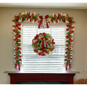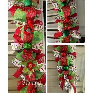 Grinch Christmas Garland Handmade, Red Green Holiday Mesh Ribbon Garland + Bows